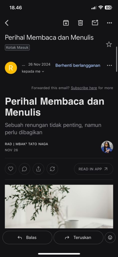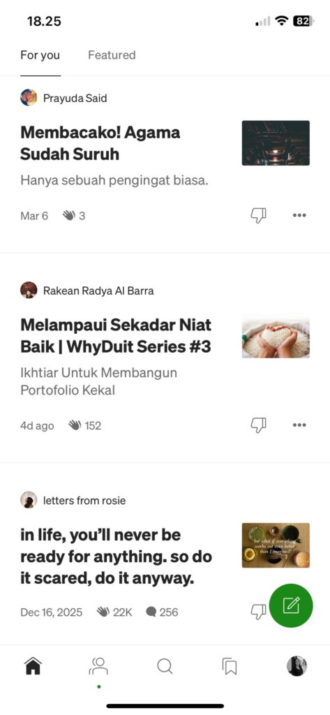 Di Substack, tulisan dikirim langsung ke email subscriber. Jadi penulis nggak bergantung algoritma, dan pembaca nerima tulisan langsung di inbox email mereka.