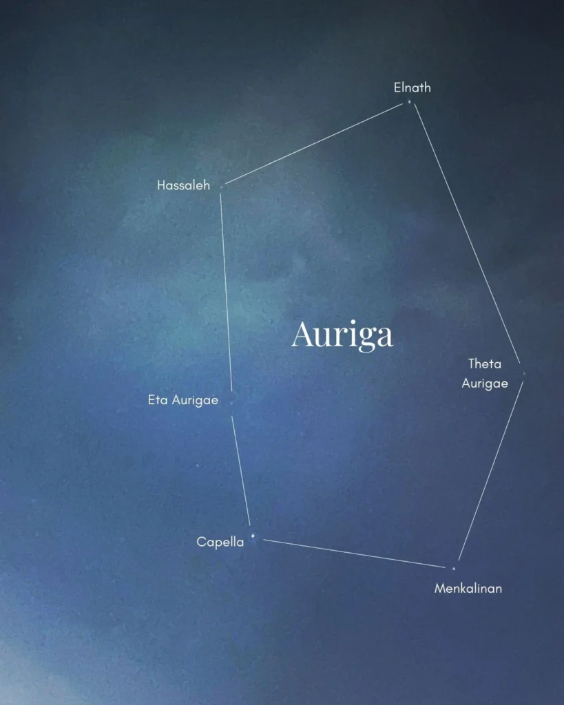 Nah, ini rasi bintang yang unik dan mudah diingat karena hanya membentuk segi lima. Bintang utama di rasi bintang ini jelas Capella karena ia bintang paling terang di antara yang lain.