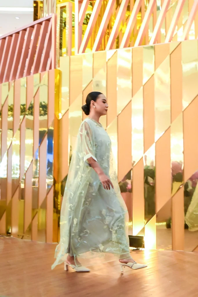 Aku menyebut busana yang aku bawakan ini sebagai Sheer Elegance, sebuah keanggunan yang subtle. Potongannya yang loose memberikan ruang bernapas pada tubuh, menciptakan siluet yang mengalir dan melambai mengikuti irama langkahku saat catwalk, seolah-olah memberikan kebebasan gerak setiap aku melangkah.