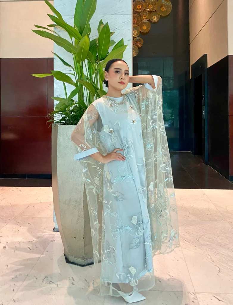 Busana ini terdiri dari dua layer: inner layer yang berbahan satin dan outer layer bermaterial tulle. Inner layer berfungsi sebagai fondasi dari busana ini. Ia memberi latar yang halus sehingga bordir tulle terlihat jelas, tapi tidak mengungkap tubuh. Hasilnya, efek sheer terasa elegan dan santun, bukan terbuka. Inner inilah yang membuat transparansi terlihat sebagai lapisan estetika.